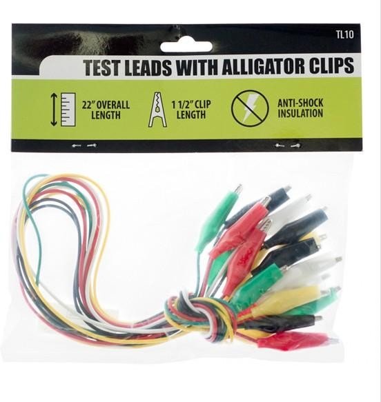 This 10-piece test lead set with alligator clips is designed for precision testing in electronic, automotive, and battery-powered projects. The 28-gauge copper wire is insulated to provide protection against shock and shorting circuits, ensuring safe and reliable testing.