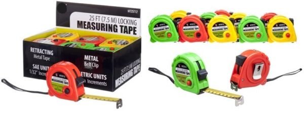 25’/1″ Locking Measuring Tape SAE/Metric W/ Belt Clip, Assorted Colors, 12 per Display
