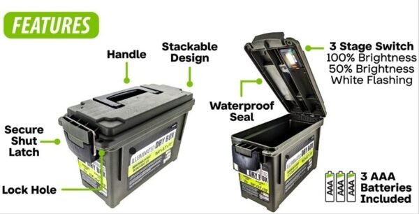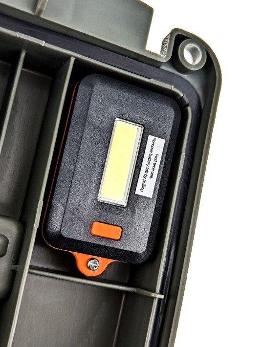 This dry box is designed to be waterproof and includes a removable COB light powered by three AAA batteries. It is constructed from PP material and features a detachable lid and light for convenience.
