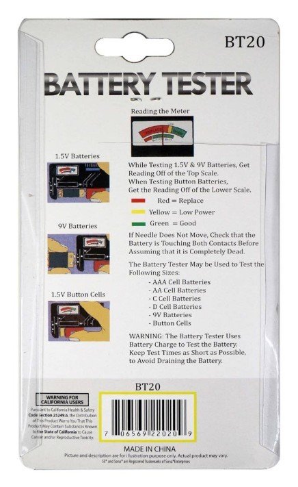 - Able to test AAA, AA, C, D, 9V, and button cell batteries.